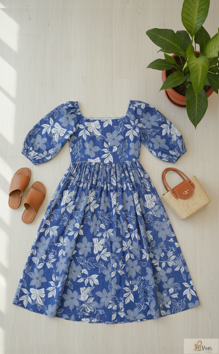 All-over white floral print on blue base
