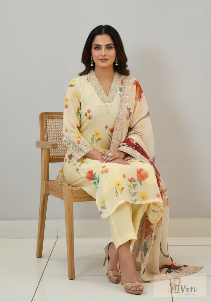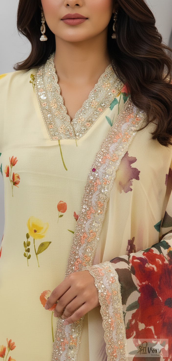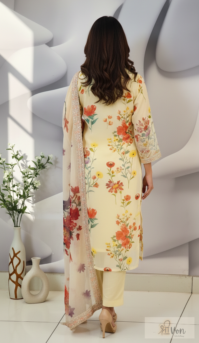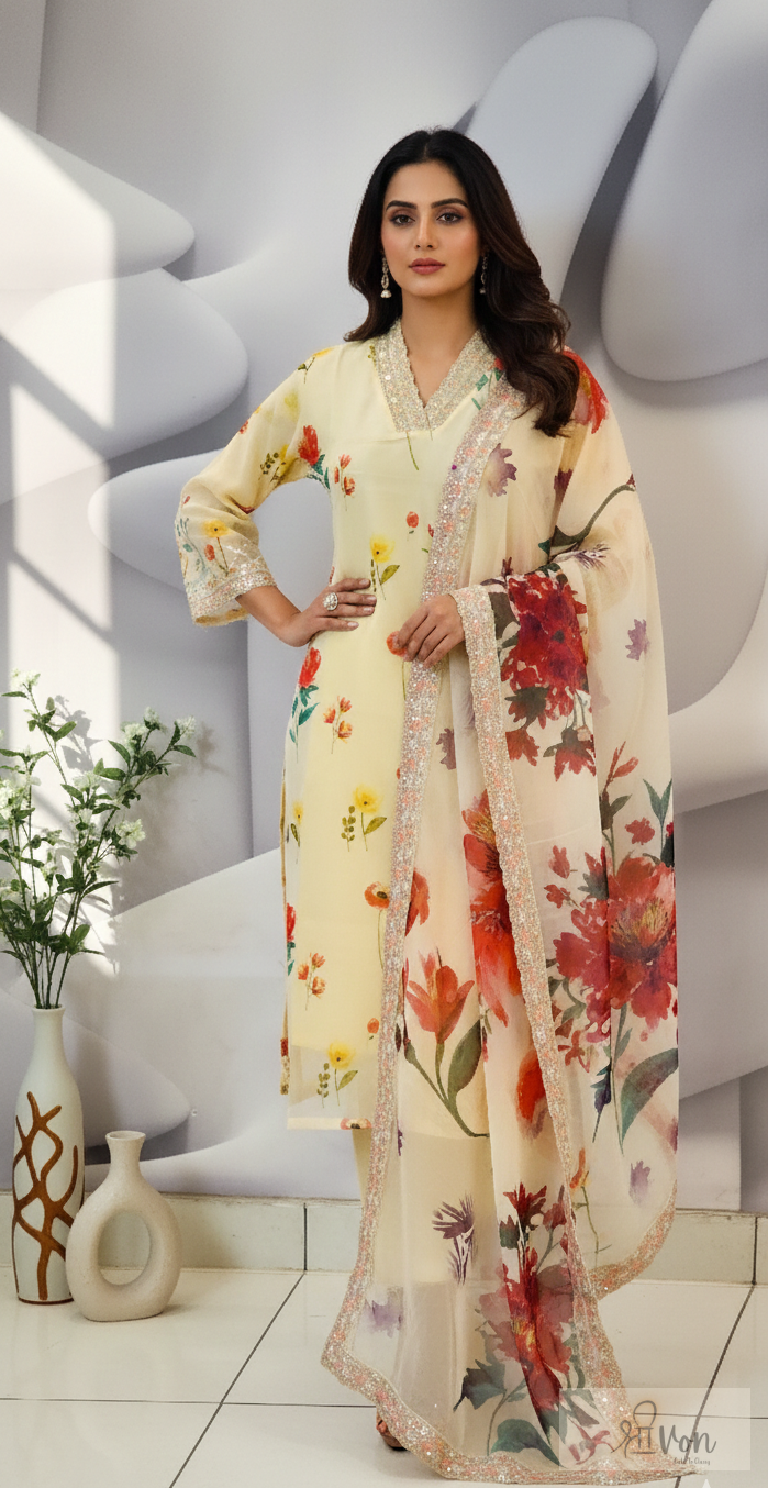 Elegant Floral Printed Organza Suit Set with Embellished Dupatta