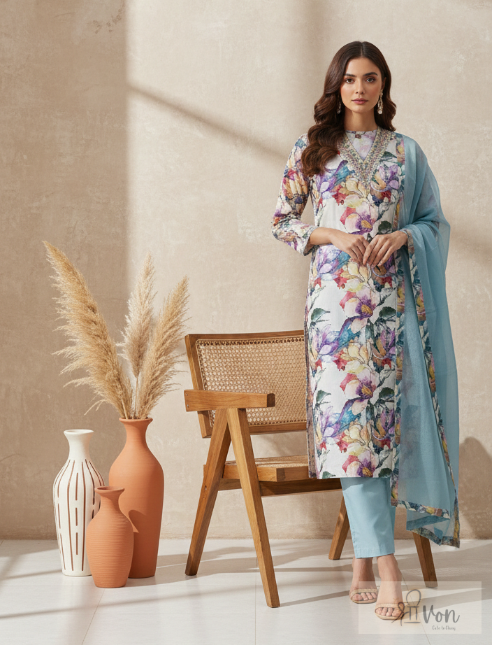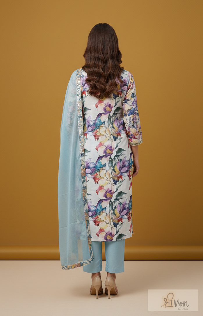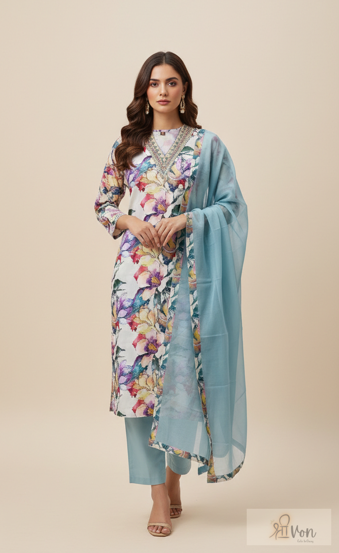 Ethnic Wear🌸 FLORAL ELEGANCE — Premium Cotton Kurta Set with Sky Blue Dupatta