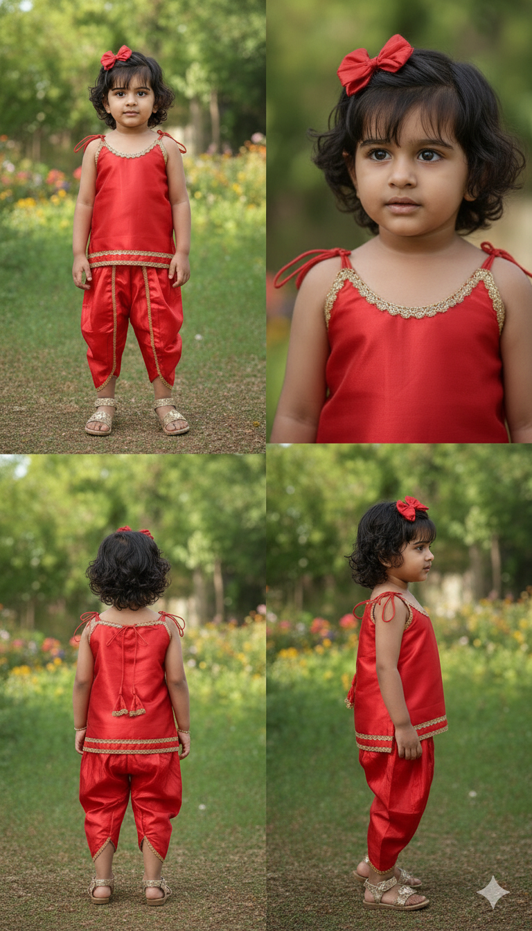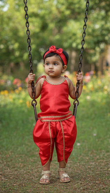“Dress your little one in divine grace with this vibrant, shimmering red satin ensemble, perfect for memorable celebrations.”