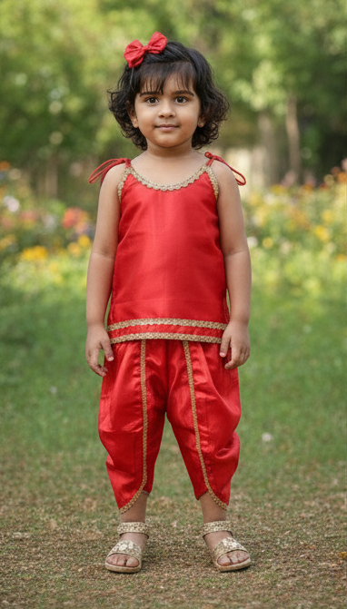 This exquisite two-piece set is crafted from a luxurious, smooth Art Silk/Satin fabric that has a beautiful sheen, offering a comfortable yet glamorous feel against delicate skin. The design features a spaghetti-strap camisole-style top and traditional dhoti pants, both meticulously edged with elegant gold lace (gota patti). The top is finished with charming tie-up shoulder straps adorned with gold tassels, and the dhoti pants feature a tulip-style drape and gathered waist, ensuring both traditional appeal and ease of movement for active kids.