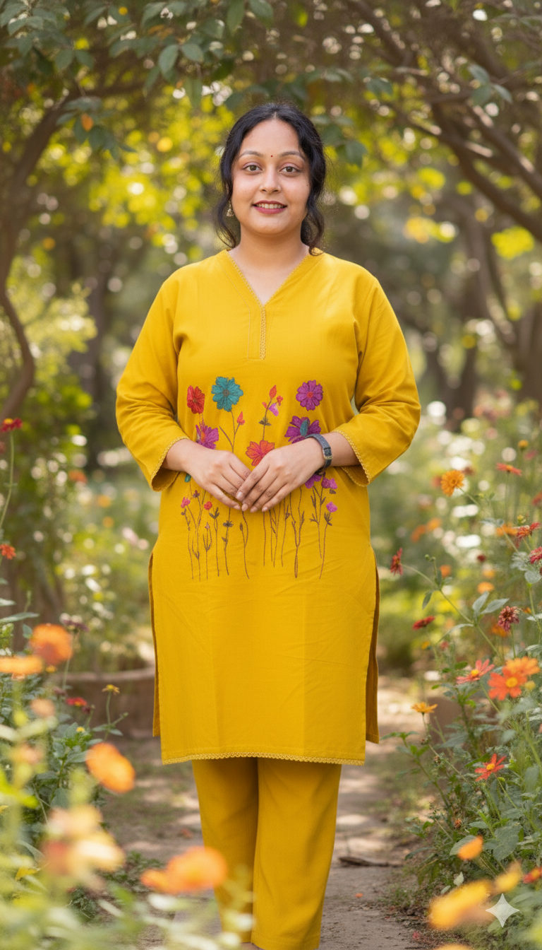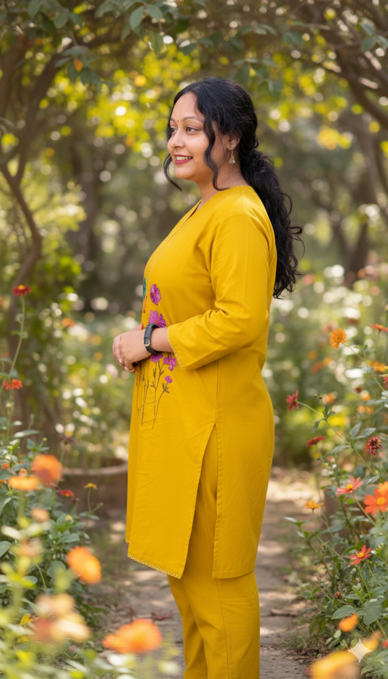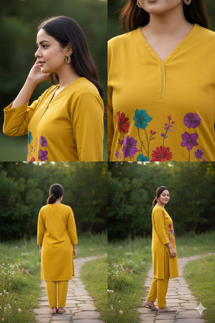 Be the first to review “Vibrant Mustard Yellow Embroidered Cotton Kurta Set | Floral Design”