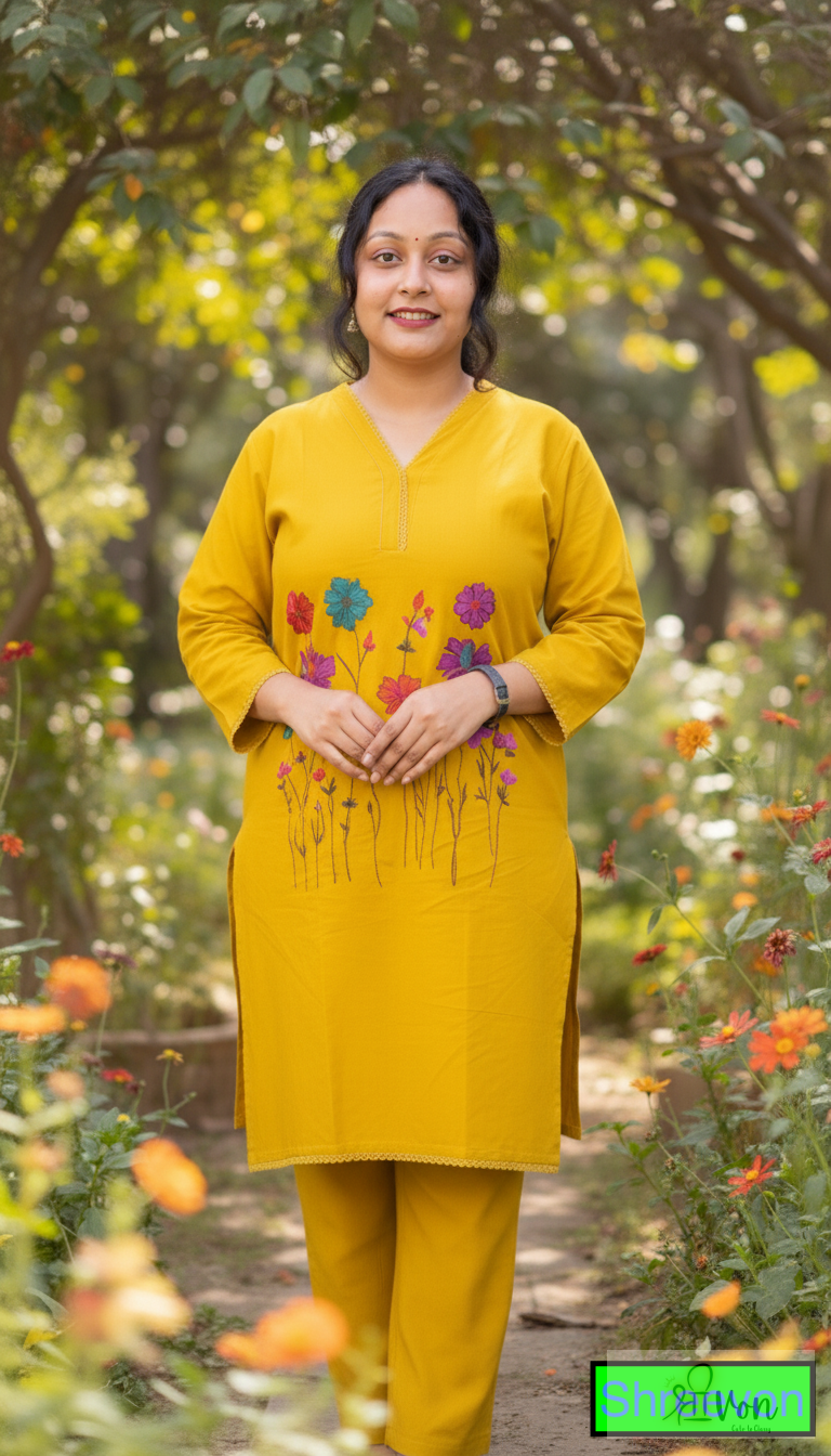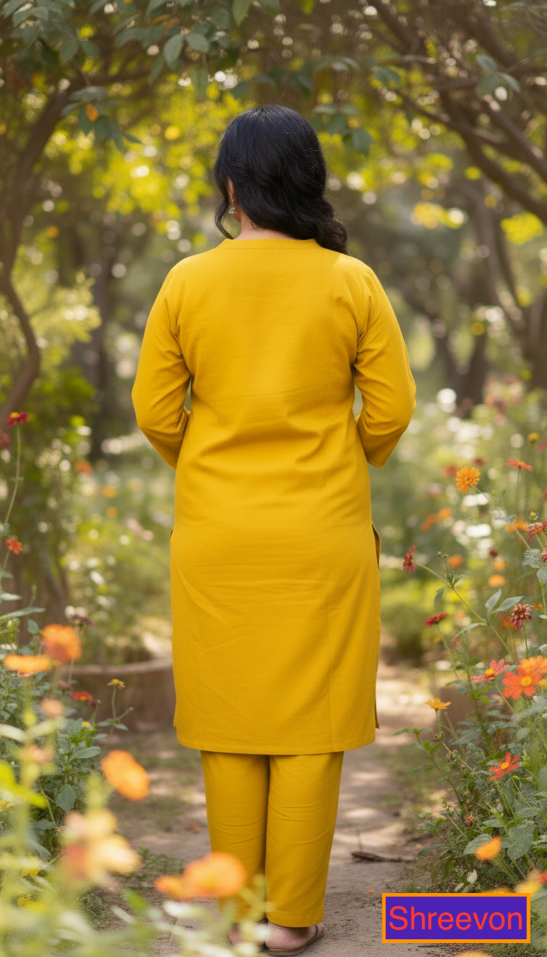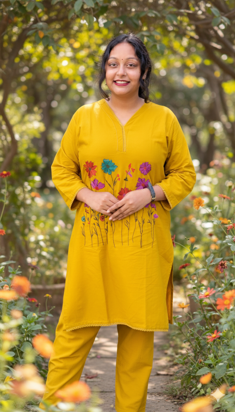 Vibrant Mustard Yellow Embroidered Cotton Kurta Set | Floral Design