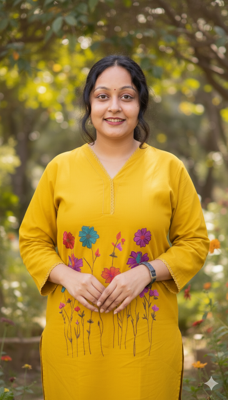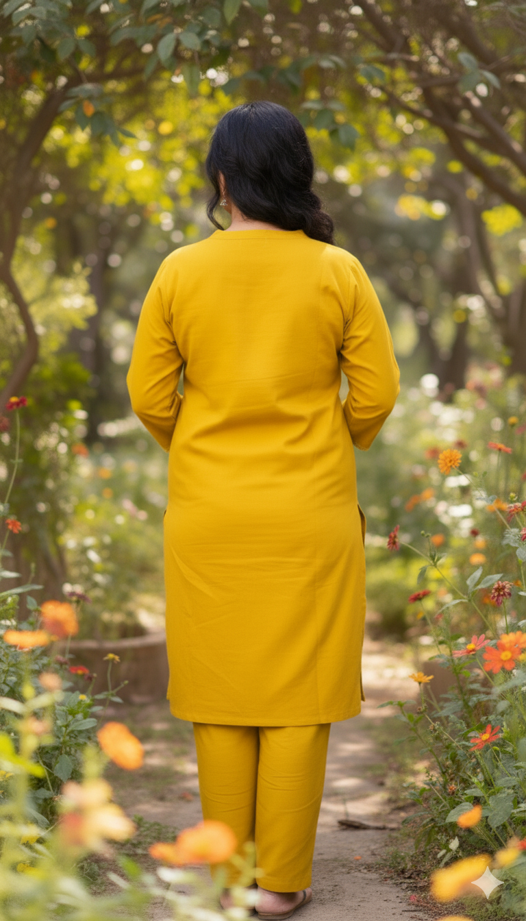 • Color: A vibrant, rich Mustard Yellow (or deep turmeric/haldi yellow), a color symbolizing joy and festivity in South Asian culture.
