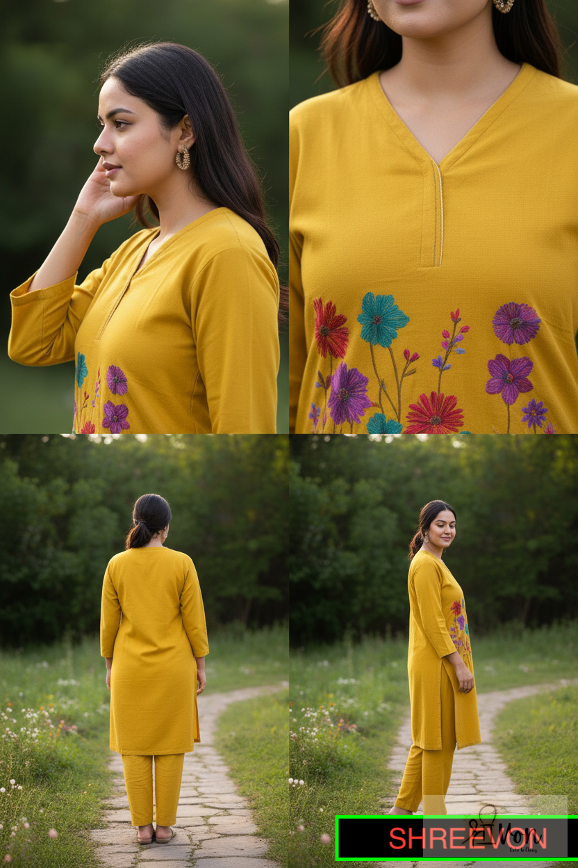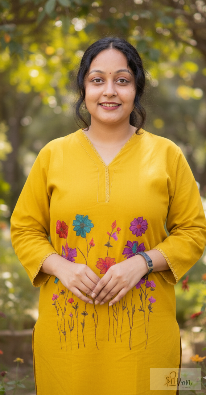➤ Solid mustard yellow kurta ➤ Front floral embroidery with vibrant threadwork ➤ Straight silhouette for a flattering fit ➤ V-notch neckline with subtle detailing ➤ Three-quarter sleeves ➤ Calf-length kurta with side slits