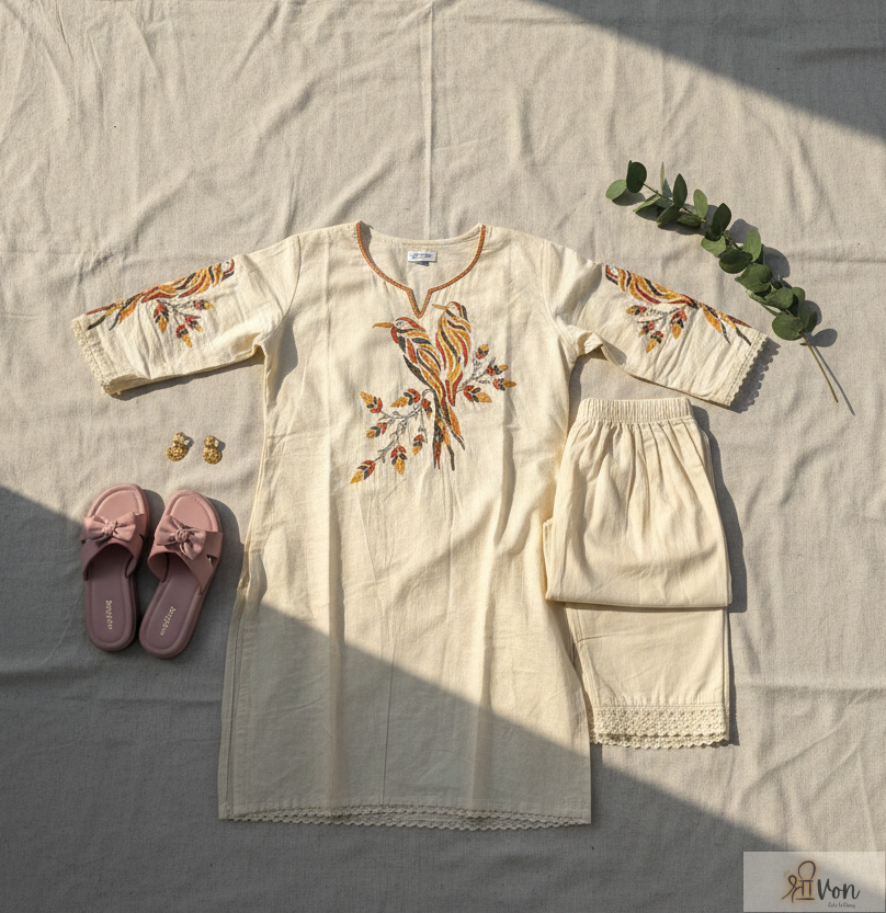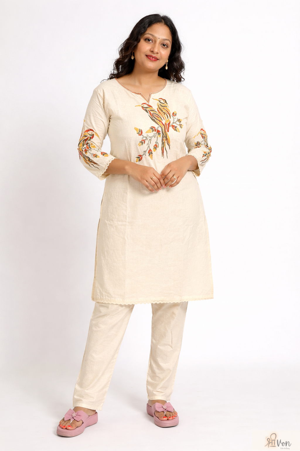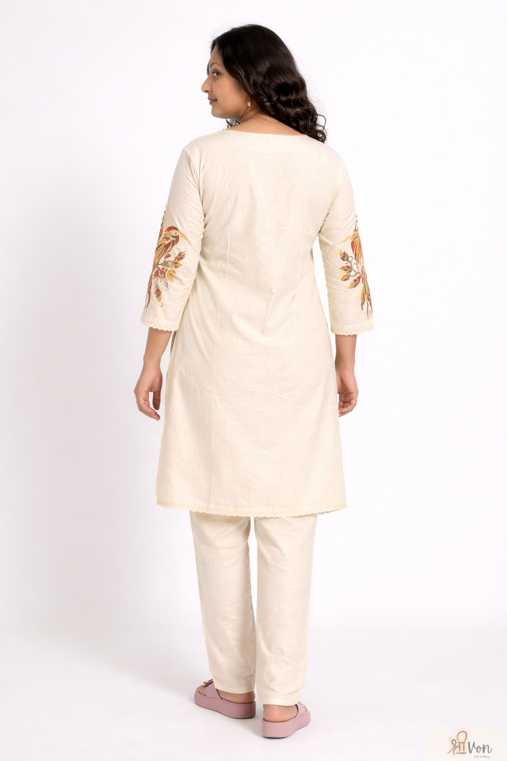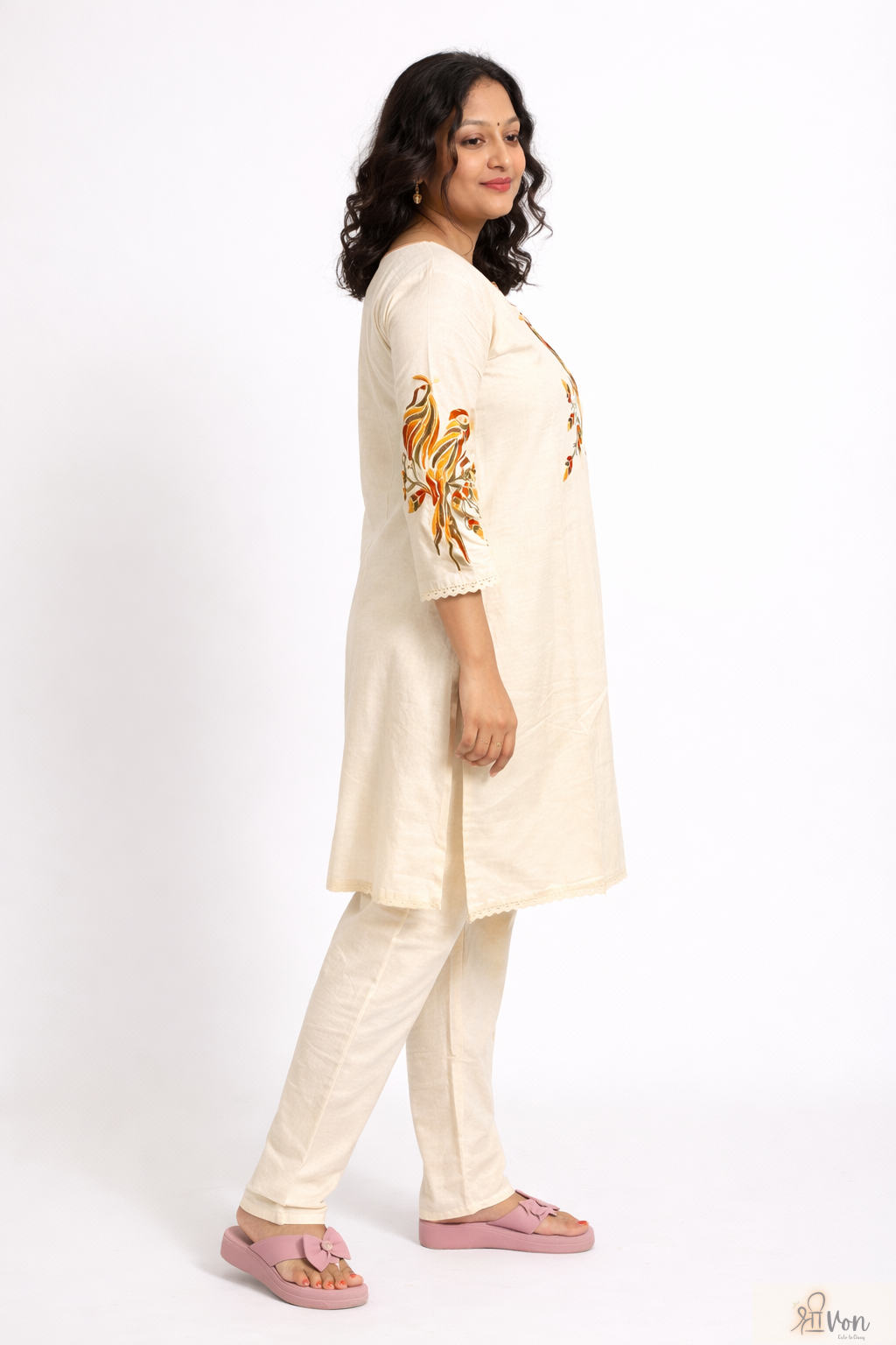 Kurta features a beautiful ethnic bird and leaf-inspired embroidery on the front
